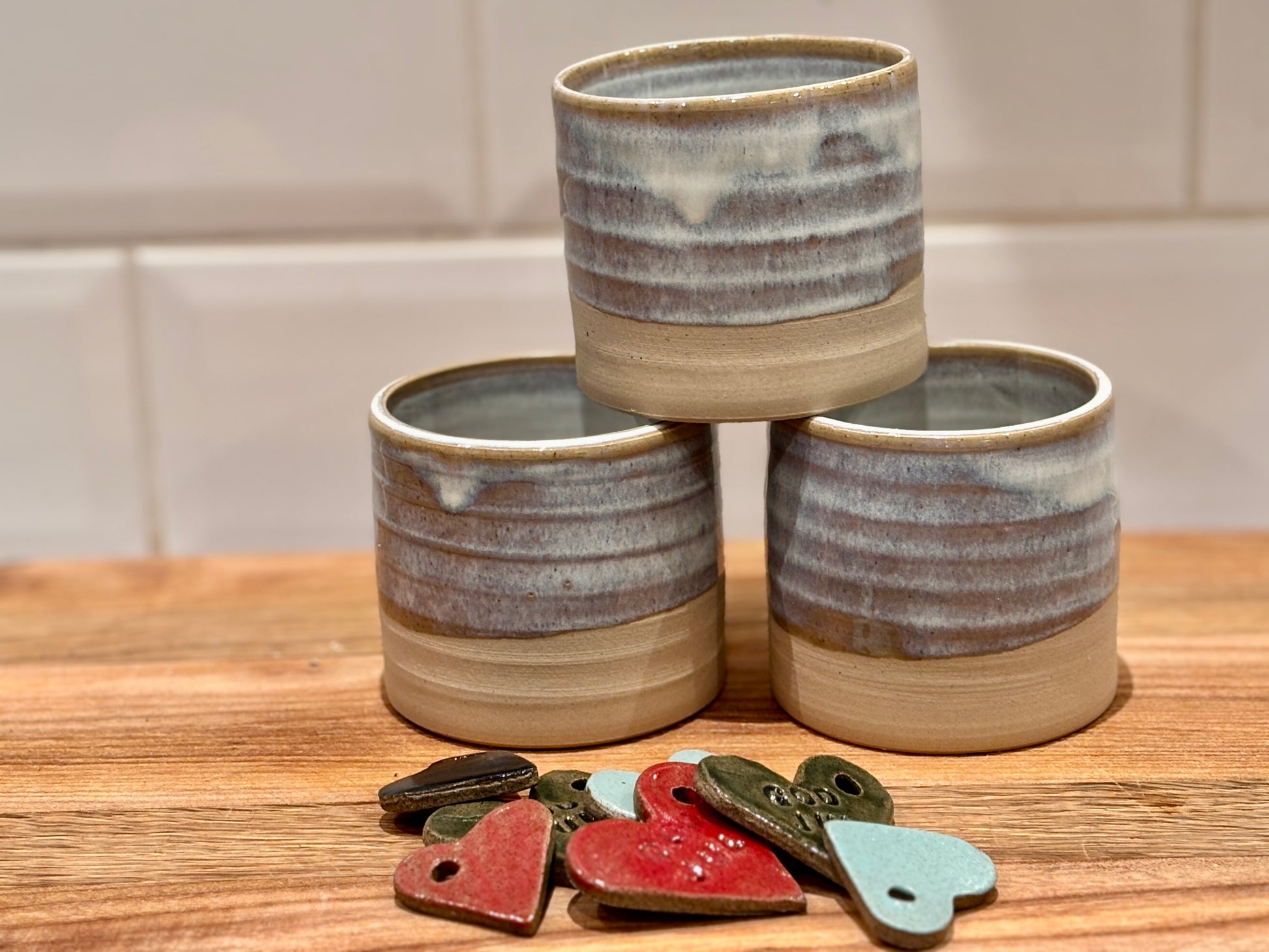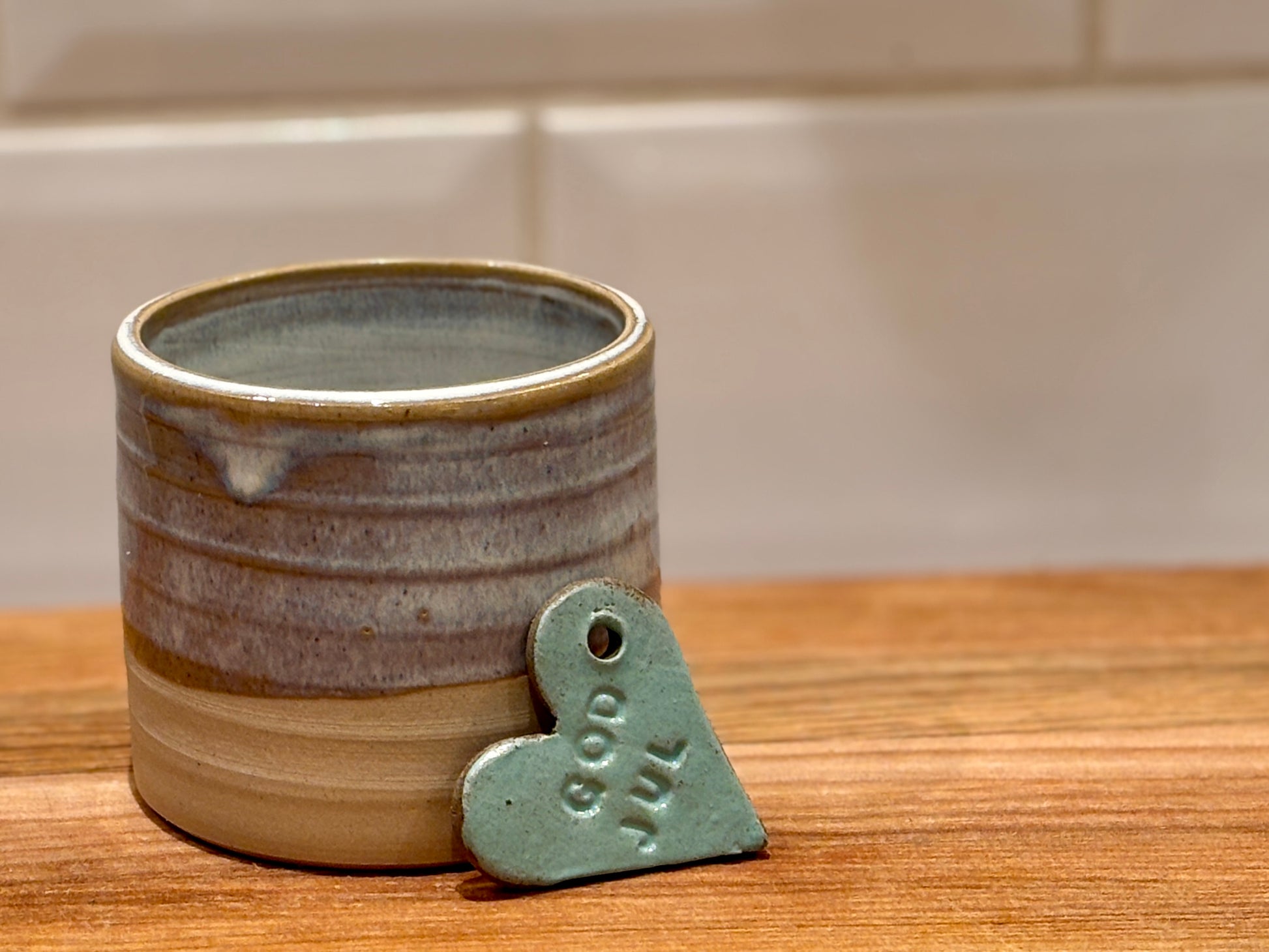 En lagom stor kopp/mugg med drejränder. Drejad i en ljudbiege stengodslera som tål både mikrovågsugn och diskmaskin. Glaserad i en vit glasyr som bryter i blått.