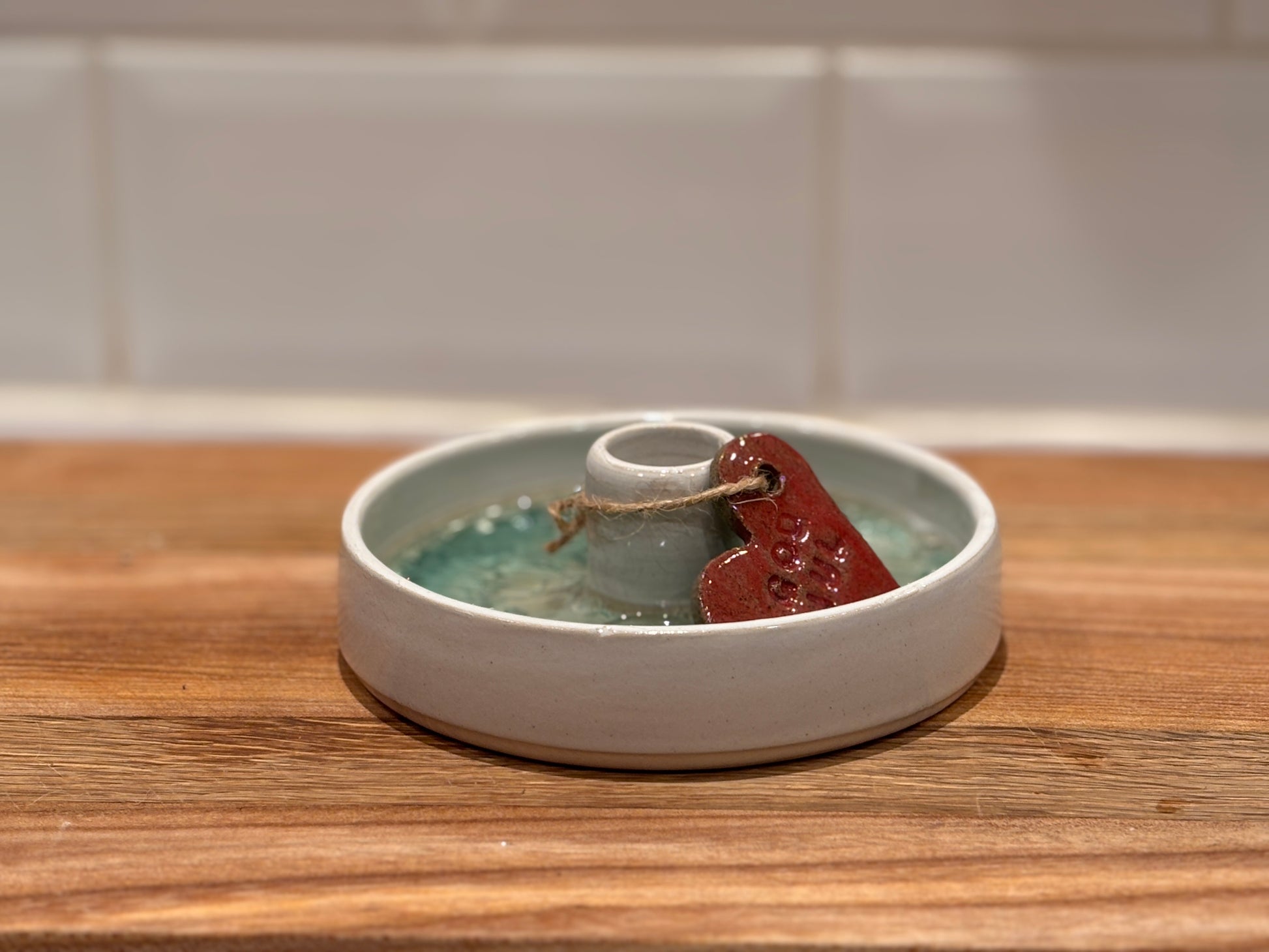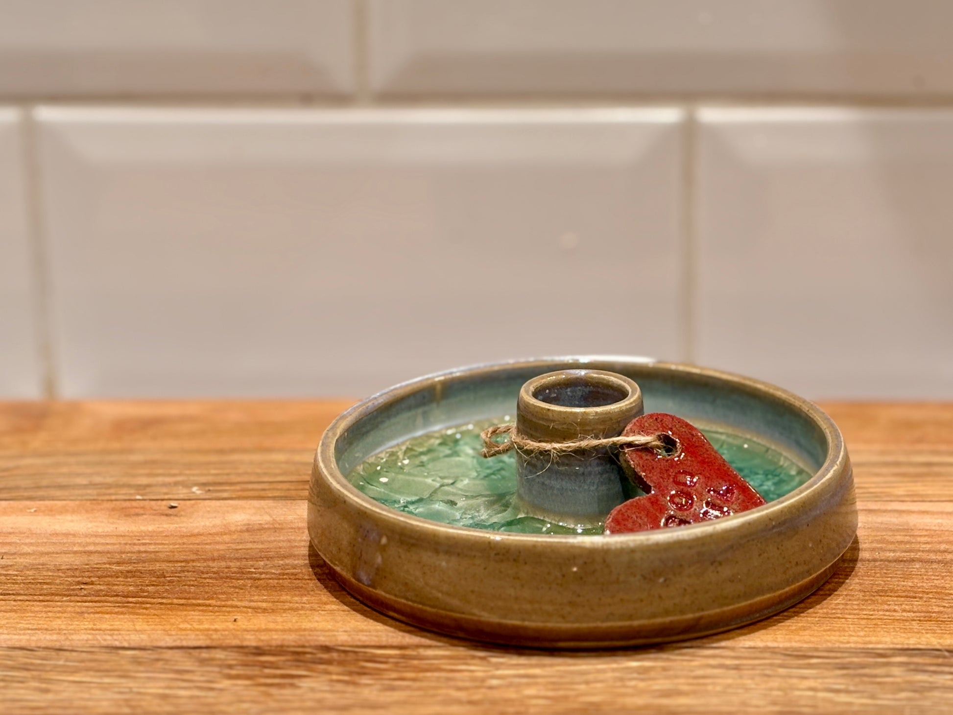 Ljusstake i ljusbeige stengodslera. Glaserade i vit- och blå/biege/vit glasyr