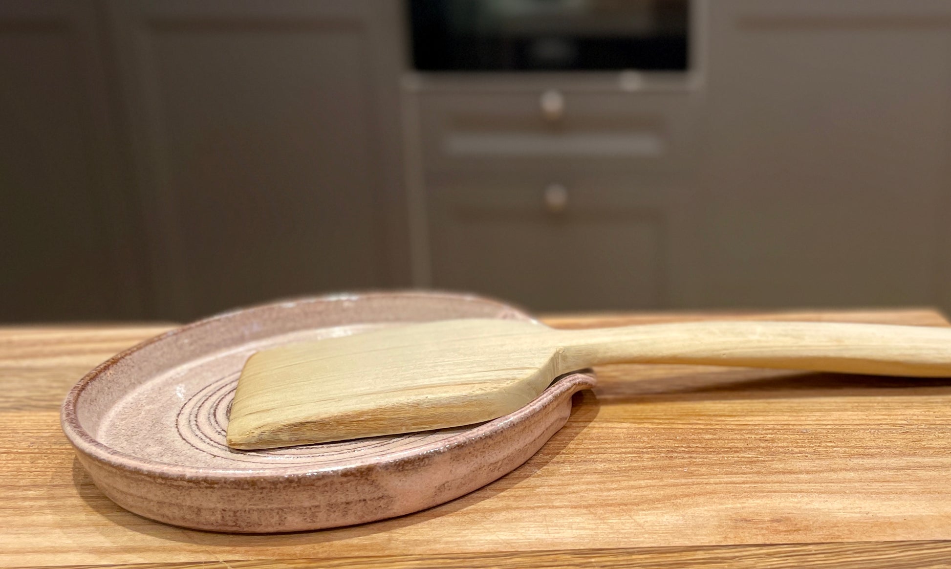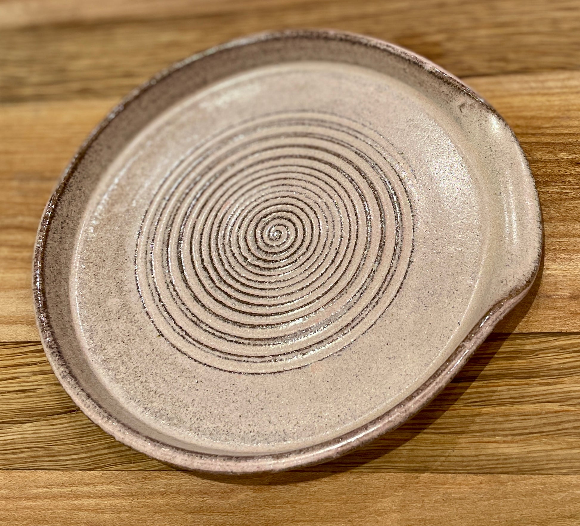 Slevfat med en rosa glasyr över en granitgrå stengodslera.