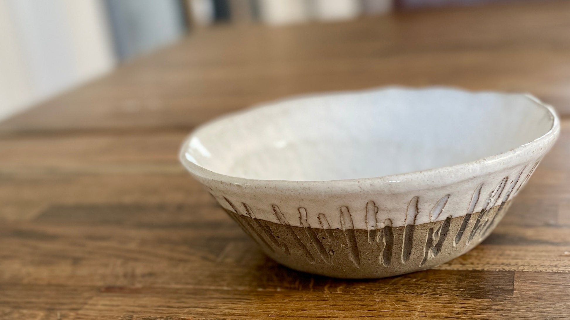 Handtummad skål med karvat mönster i mörkgrå lera, halvt glaserad med vit glasyr.