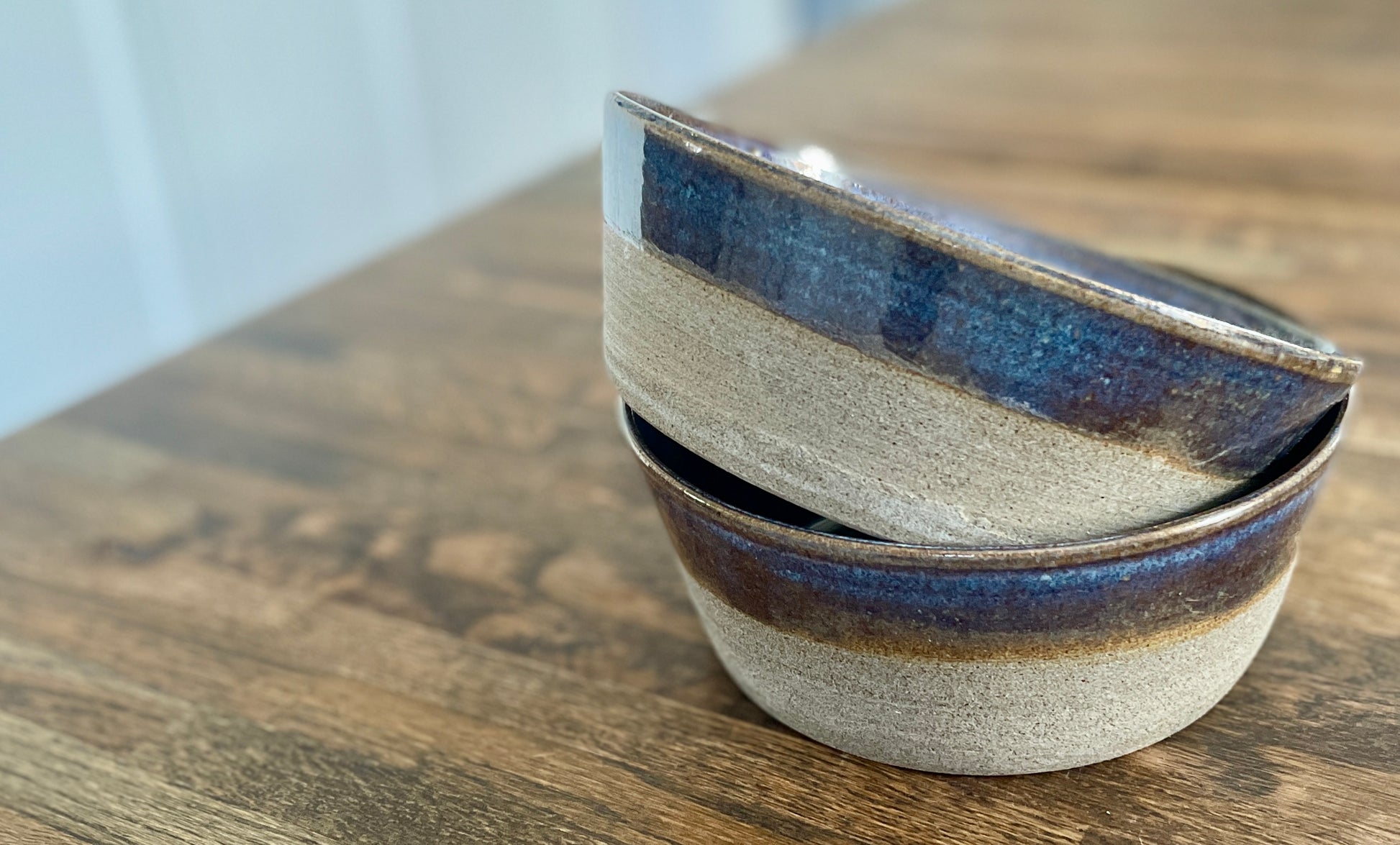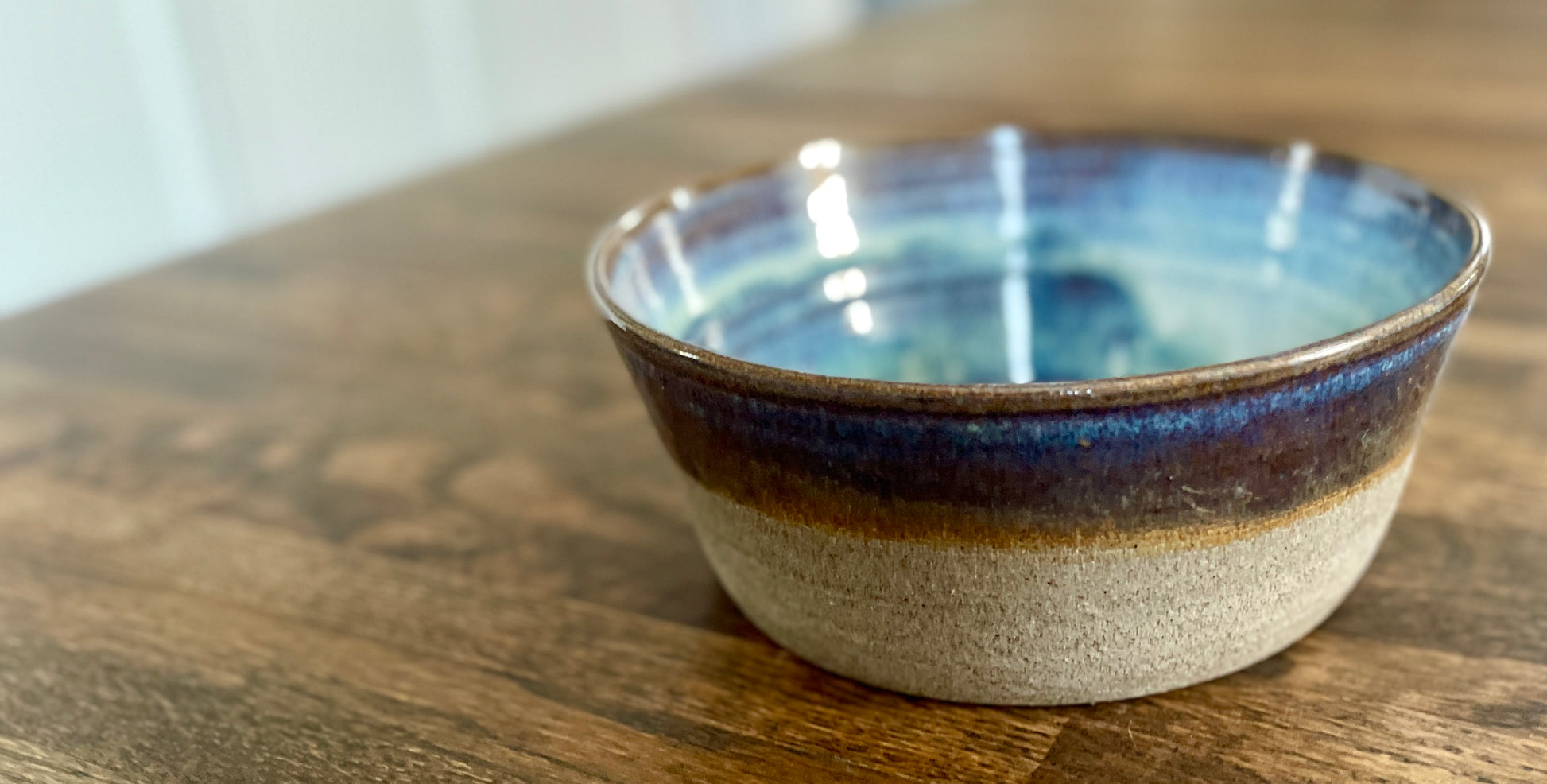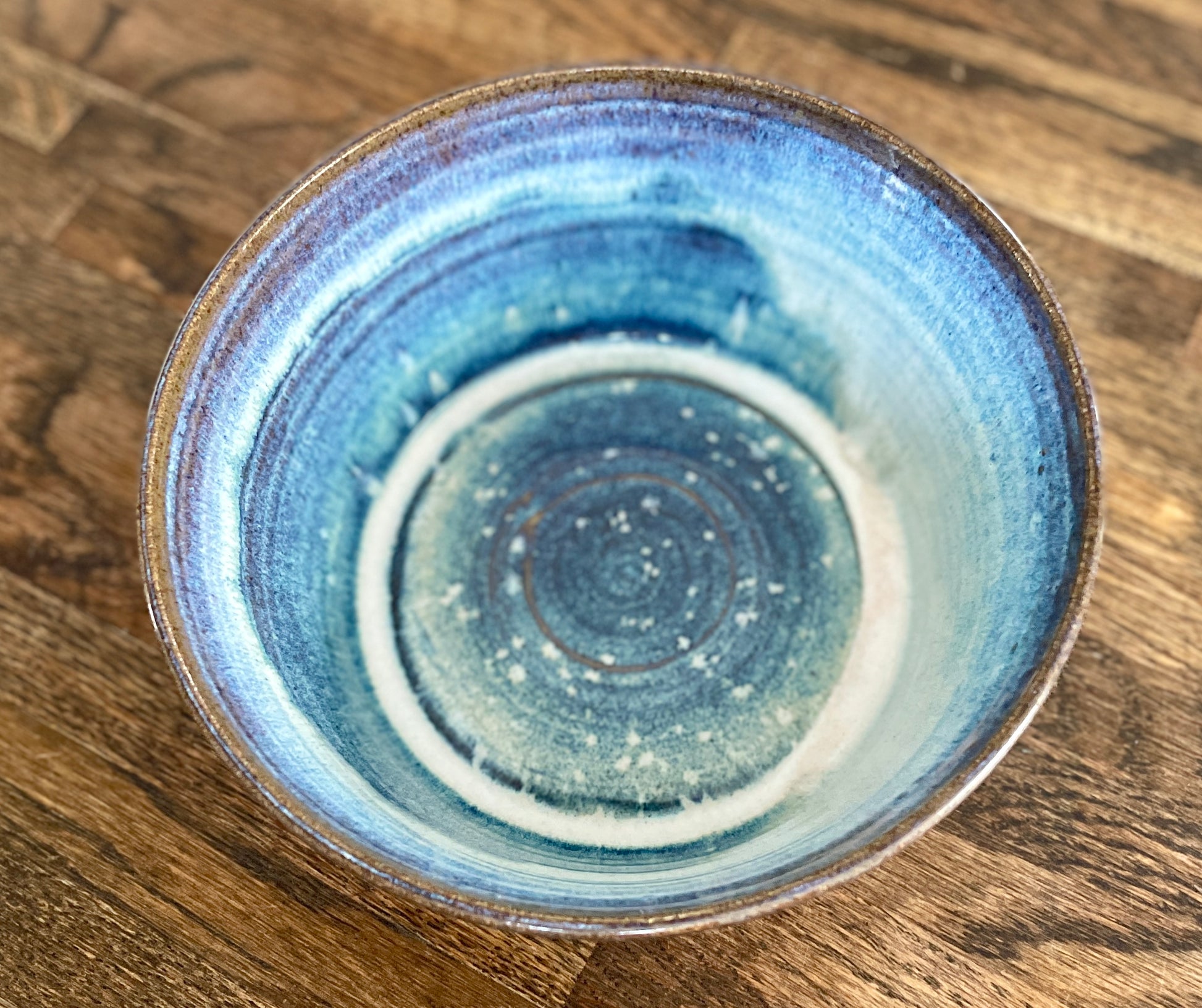 Drejad frukostskål i mörkgrå lera, halvglaserad med en havsblå glasyr.